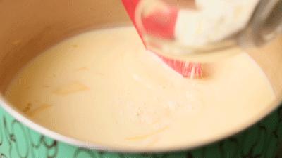 2. 然后放入奶酪片和奶粉,然后开小火慢慢加热,一边加热一边不断搅拌,直到奶糊变粘,然后熄火。(这个过程一定是全程文火,搅拌动作不能停止,否则很容易糊底,功亏一篑)