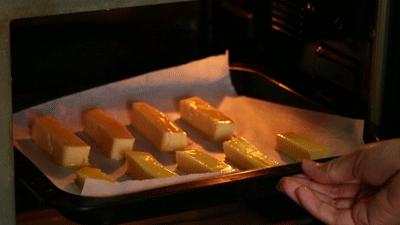 在烤箱里烤的时候,香味已经很吸引人了。看到烤箱里的牛奶条表面逐渐变黄,说明牛奶条差不多烤好了。时间到了,你可以拿出来吃!