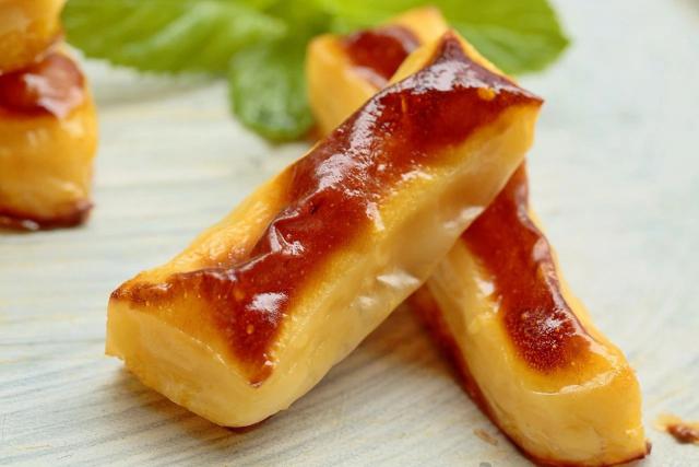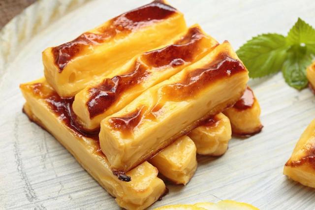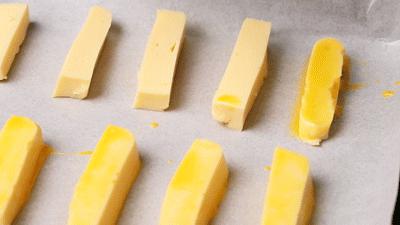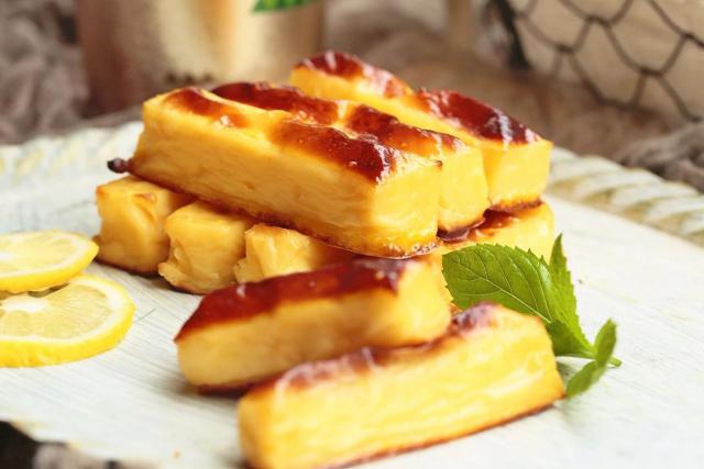 4. 取出定型的奶块,切成粗细匀称的小长条,平整地代码在烤纸垫的烤盘里。它们之间应该有一点间隔,然后在每个奶条表面刷上蛋液,放入预热好的烤箱,220。 ℃烤 20 分钟即可。