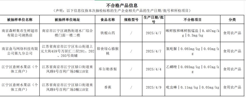 抽样检验结果显示,520批食品样品合格,4批样品不合格。即食绿心猕猴桃(出厂日期/批号:2025/4/7)由南京盒马网络科技有限公司第九分公司销售,氯吡脲不符合国家食品安全标准,检测结果0.085mg/kg,0.05mg/标准值kg。氯吡脲是一种常见的膨大剂,对植物有助长、快速生长的作用,过量食用可引起人体中毒、致癌、肝损伤、神经系统等。