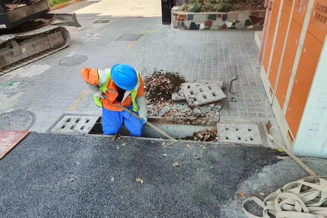 此外,施工方还采用居民建议,将市政隔离栏缩短2米,拓宽小区入口通行空间,使车辆进出更加顺畅。同时,为了消除潜在的存水问题,小区门口的排水沟也进行了充分的疏通,斜坡内侧设置了线性排水沟,为汛期筑牢排水防线。