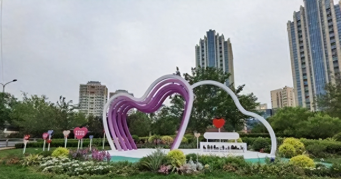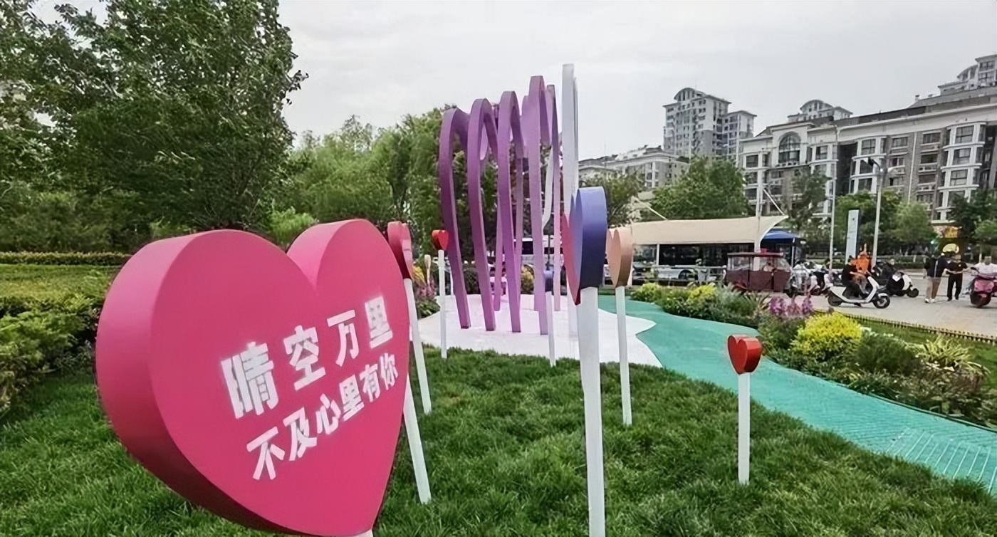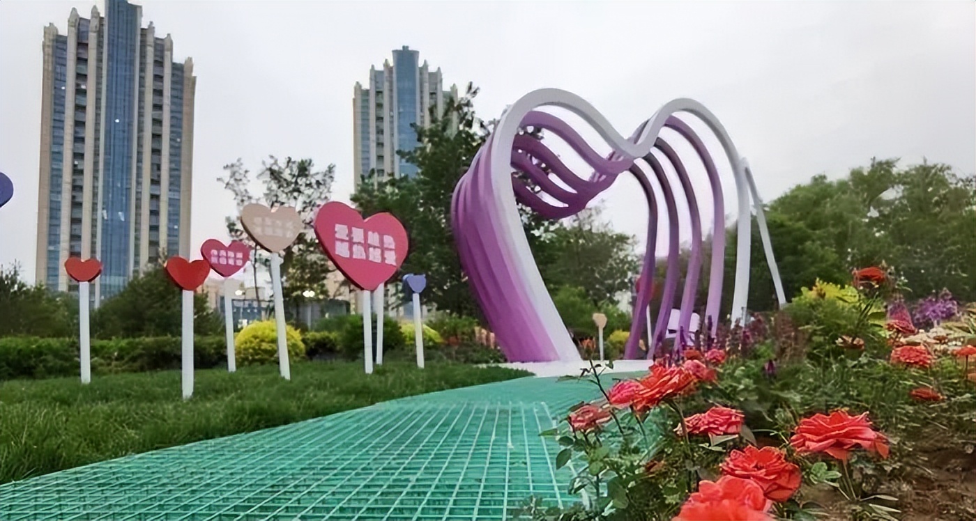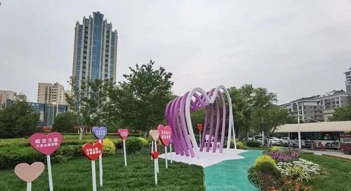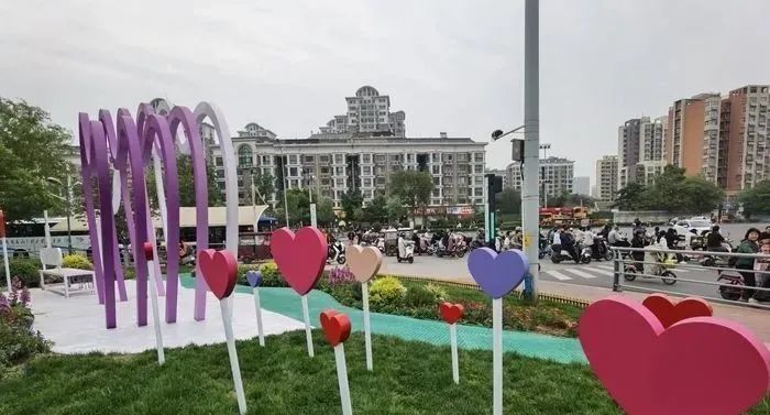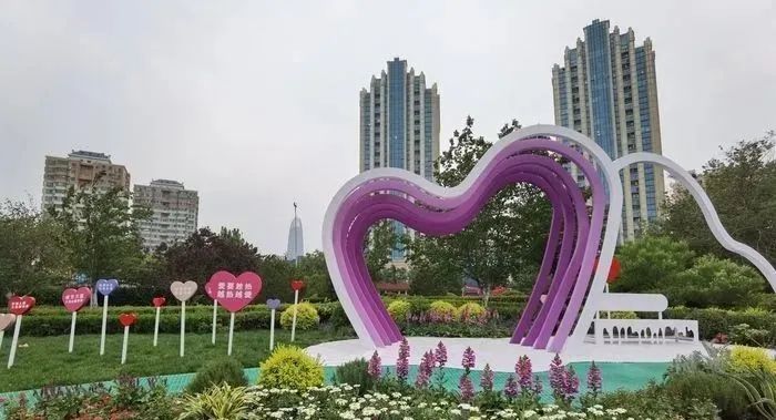 在公园的心形艺术造型之前,种植了各种时令花卉,形成了错落有致的景观效果。草丛中的装饰牌上“爱要趁热,越热越爱”、“心里还不如你”等温暖的句子营造出温馨浪漫的氛围。“小而精”的“口袋公园”为初夏的泉城增添了五颜六色的色彩。