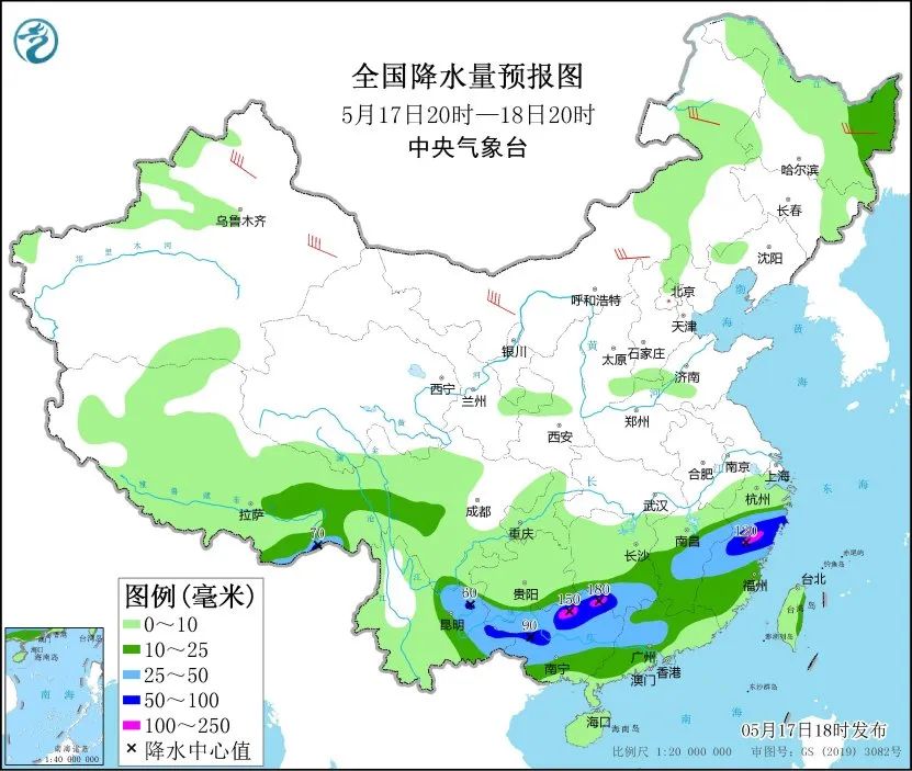黑龙江东部、西藏东南部、云南东部、湖南南部、江西东部、浙江南部、福建北部、广西、广东中北部等部分地区有中到大雨。其中,西藏东南部、云南东部、广西中北部、浙江南部、福建北部等部分地区暴雨,局部暴雨(100。~180mm)。内蒙古东北部、中部、黑龙江东北部等部分地区有4个~6级风,内蒙古西北部、新疆北疆东部、东部等部分地区6级风,~7级风。