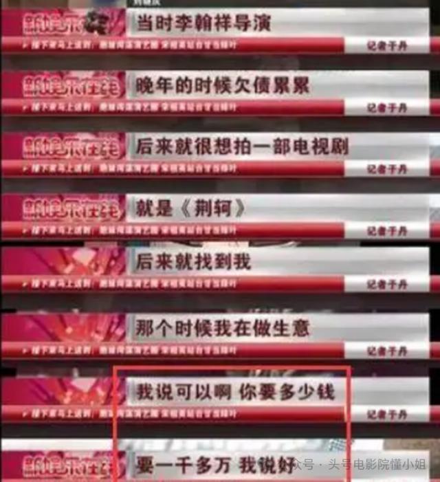 曾经和她合作过的导演李翰祥,晚年负债累累。如果他想拍电视剧《荆轲》,他会找到刘晓庆(投资)。当时她在做生意,刘晓庆回忆说:“我说好,你要多少钱?”