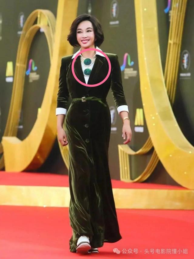 不像许多女明星走红毯,珠宝饰品都是靠品牌赞助,刘晓庆戴的这条价值上亿的翡翠项链,就是她自己的。