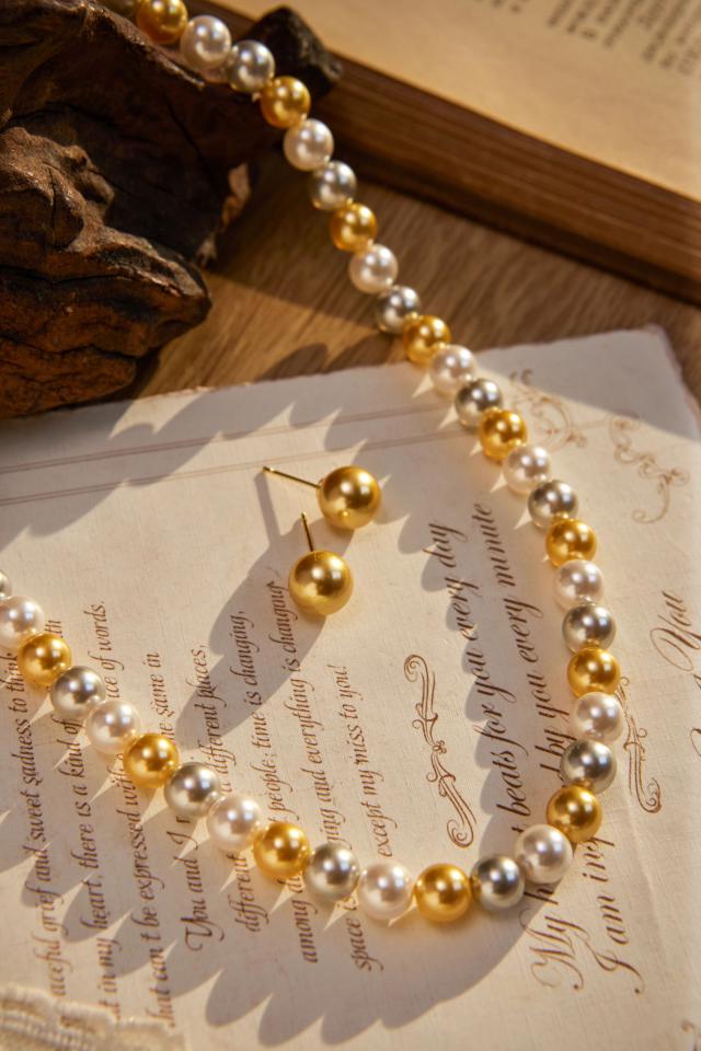颈链优选 7-8mm 施家珍珠,耳环是简约风格的耳环;以设计风格演绎都市时尚风格,珍珠圆润饱满,颗颗色彩变幻。