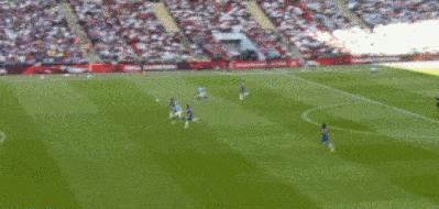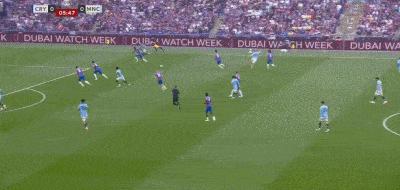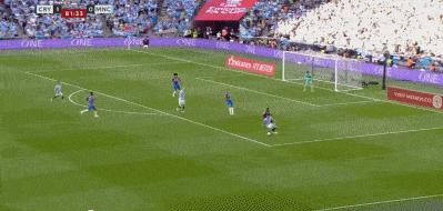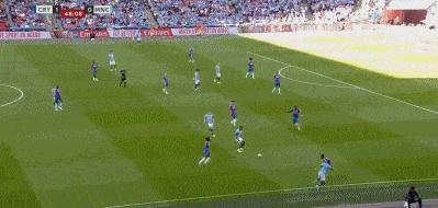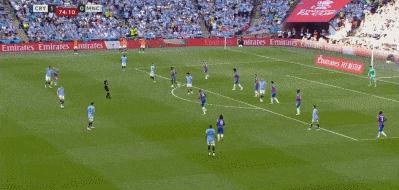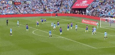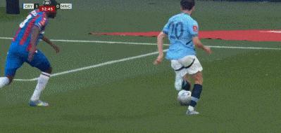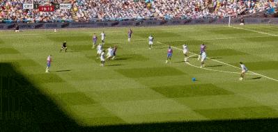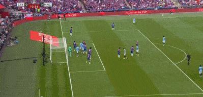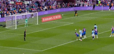 第 97 在曼城底线周围传球导致水晶宫救场十分靠近,弧顶附近的德布劳内迎球撩射,足球擦着右柱偏离。