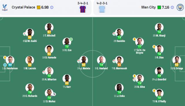 水晶宫:1- 迪恩 - 亨德森、3- 米切尔、5- 拉克鲁瓦、6- 格伊(61 ’ 8- 莱尔马)、12- 穆尼奥斯、26- 克里斯 - 理查兹、10- 埃泽、18- 镰田地面、20- 沃顿(87 ’ 19- 威尔 - 休斯)、7- 伊斯梅拉 - 萨尔、14- 马特塔