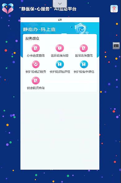同时,静安医保政务小程序——“静心办公、码上查”也展示在智能产品上,其功能包括高频医保事项模块,如“工作进度查询”、“医保政策问答”、“医保政策查询”、“长期护理保险就近服务”、“长期护理保险远程评估”、“长期护理保险集中评估”、“健康数据统计”等。