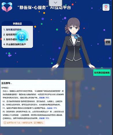 这款名为“静医保心服务”的智能设备,通过AI数字人技术和DeepSeek的深度链接,选择AI语音交互,协助完成医保相关政策问题的解答,形象为虚拟数字人物“小静”。只要把需求告诉屏幕,系统就会立即弹出处理流程和材料清单。他说:“以前要排队问窗口工作人员,现在好像有个医保顾问随叫随到。刚刚体验过AI服务的李阿姨笑着说。