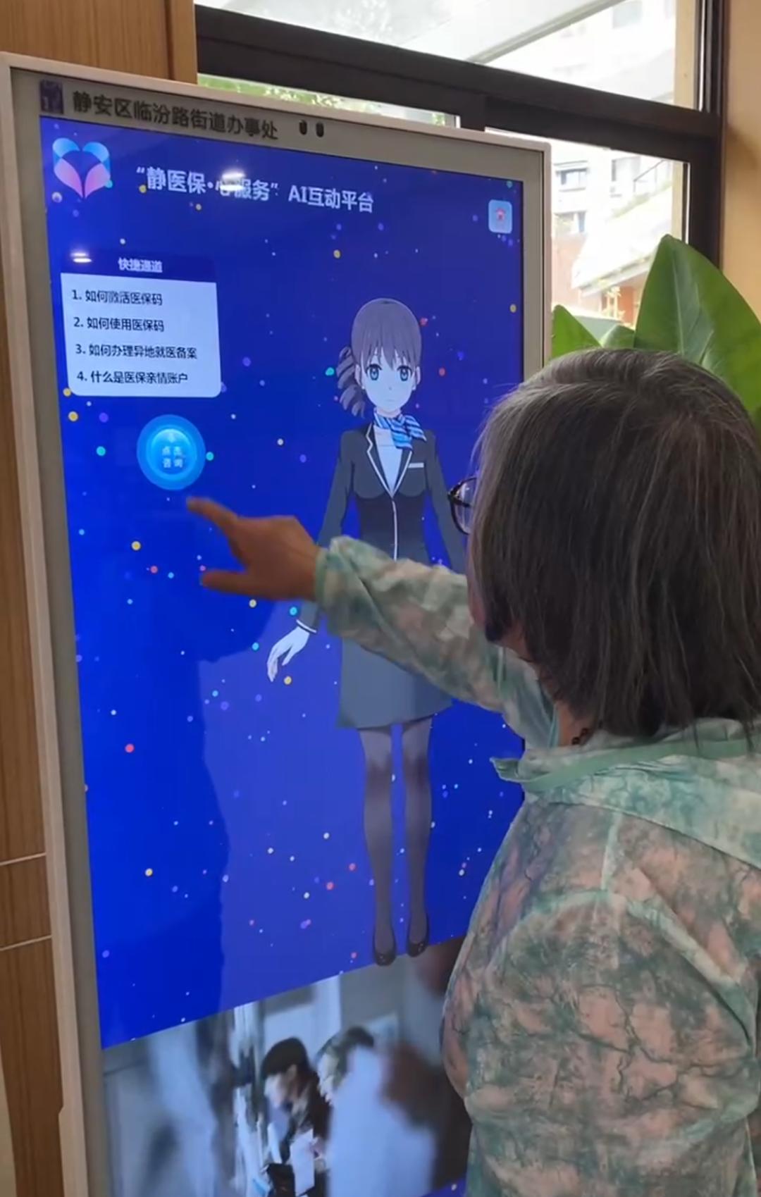 在静安区医保中心服务大厅,在一台闪着蓝光的智能设备前,居民张小姐正在与屏幕上的虚拟导游“小静”交谈。不到一分钟,她就搞清楚了怎么开医保家庭账户,忍不住感慨:“说得很清楚,一听就懂。”