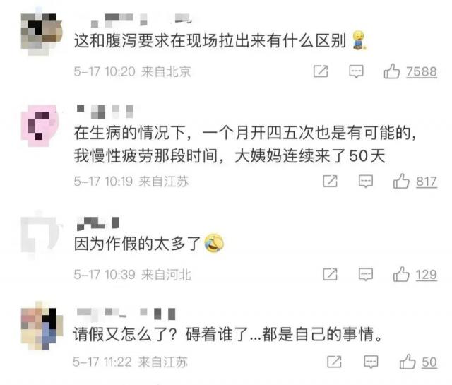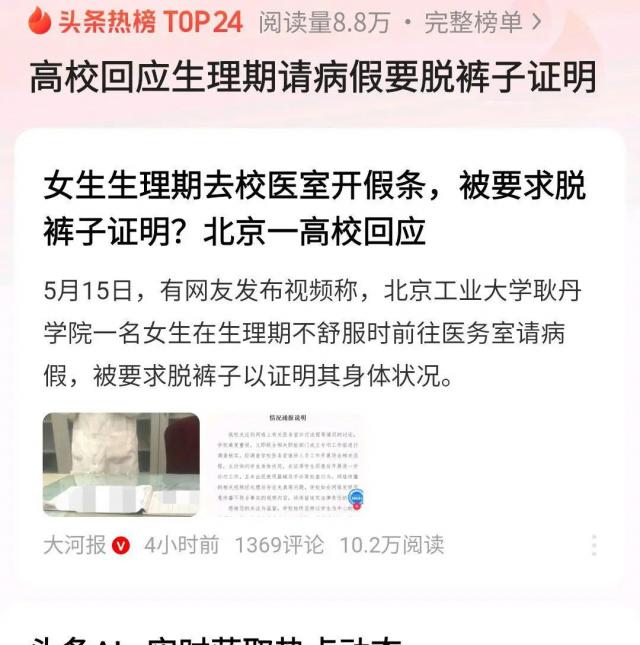 5 月 15 日,有网友发布视频称,北京工业大学耿丹学院的一名女生在生理期不舒服时去医务所请病假,被要求脱裤子确认身体状况,引起了舆论的极大关注。