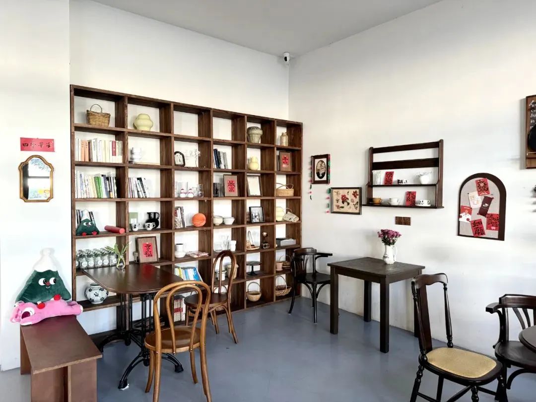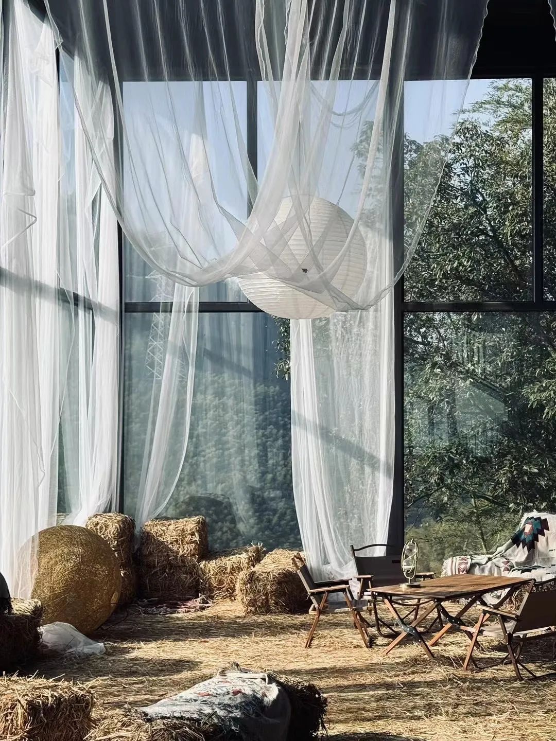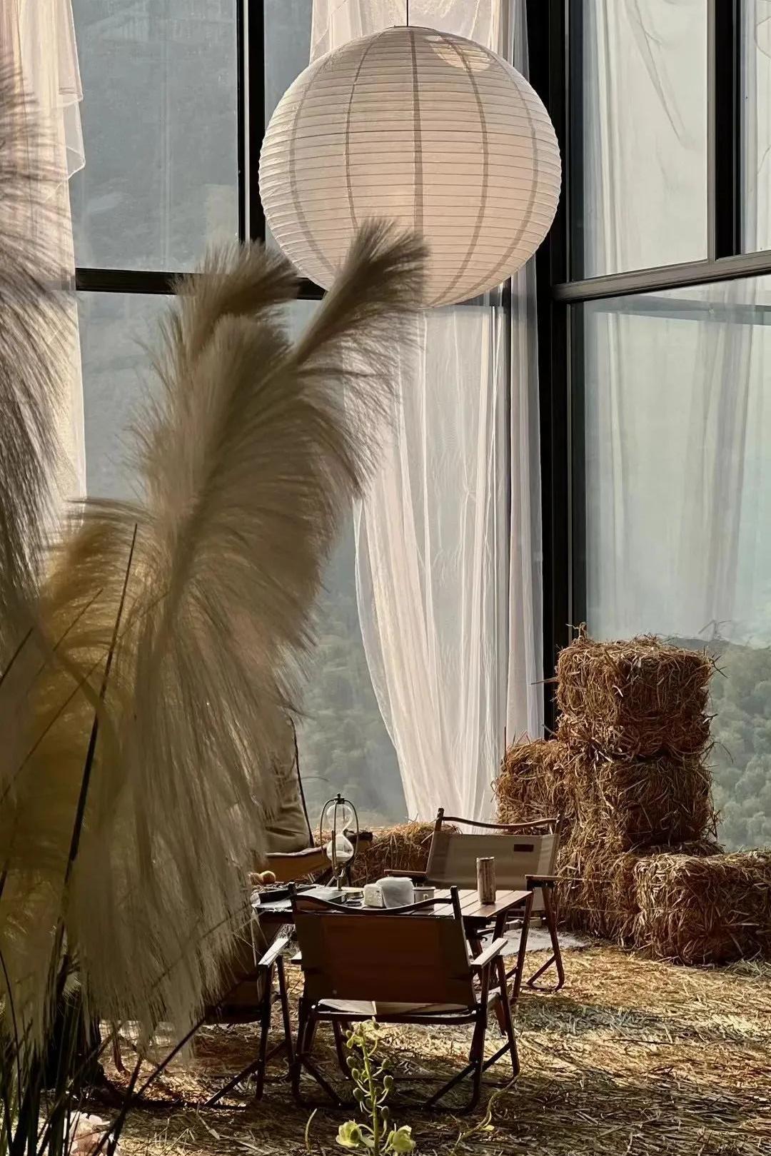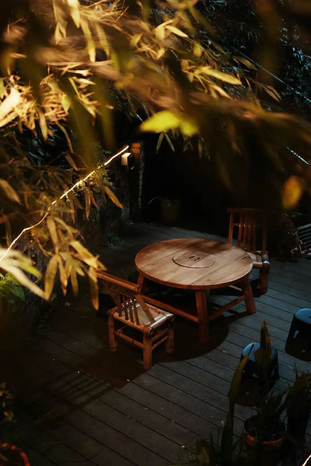 木制或水泥砖制成的小桌子和露营风格的椅子