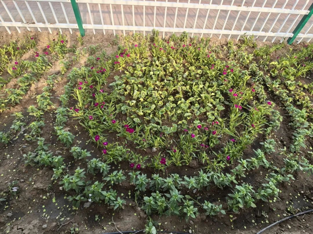 办公室小徐主任和沈师傅是开园出力最大的。种花需要好土,老沈他们从院子西边的花池里挖土,运到花园里(西花池改做菜园,种茄子,辣椒和西红柿)。花苗刚种完,需要足够的水分,老李师傅等人每天从院子里接水管给花园浇水。另一位师傅负责每天捡白色垃圾,保证花园清洁,是因为花苗长得很好。今年种了天竺、玫瑰、风信子等生命力很强的花。老沈在花池里做了几个形状,还在栏外的大树下撒了地锦(爬山虎)种子和星草种子。我们的护栏有2米多高,可想而知,当爬山虎爬满护栏时,将是一道多么美丽的风景。