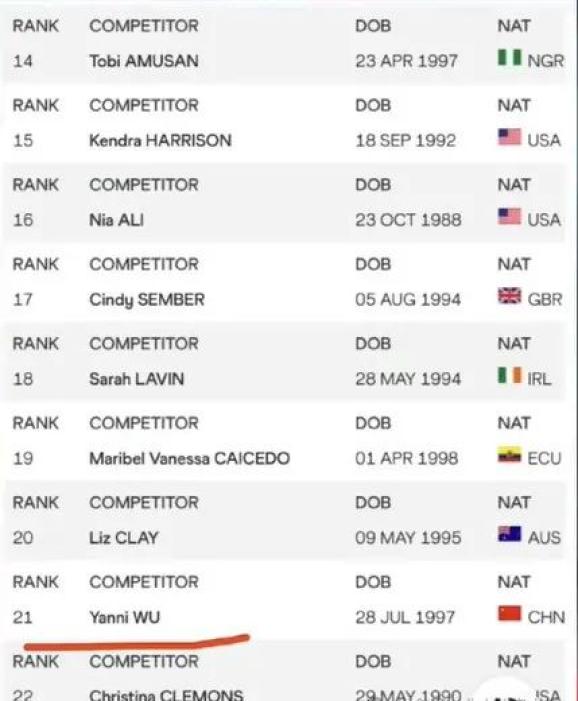 同一天,国际田联宣布了最新的世界排名,吴艳妮再次获得第21名,再次刷新了个人和中国选手在这个项目中的最高记录。
