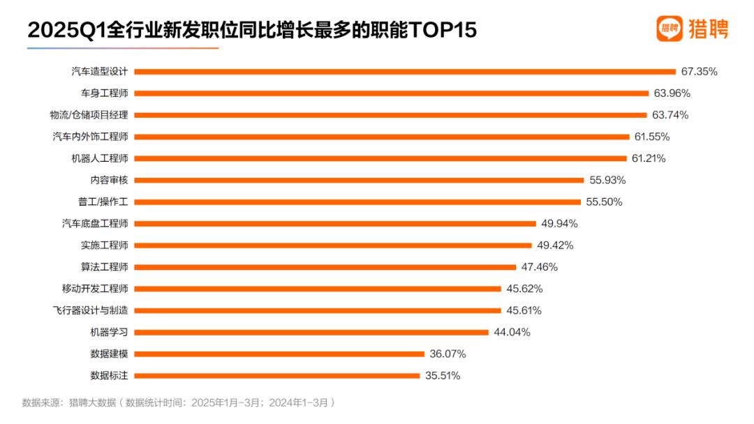 从猎聘今年一季度新发职位职位数据来看机器人工程师、算法工程师、机器学习、数据标注等一些AI相关职位数量同比去年增长明显。