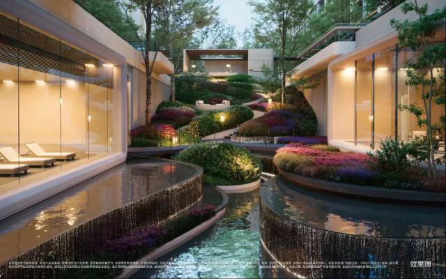 根据效果图,下沉庭院主要是水系景观,两侧是地下会所,出来后可以沿着景观小路到达地面。