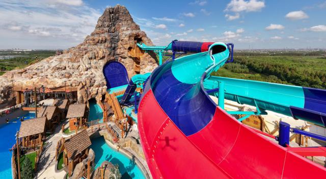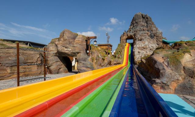 彩虹滑道长度超过 90 米,高度超 14 米饭,从耀雪水世界山顶一滑而下,滑行速度可以达到 13.7 米 / 秒。