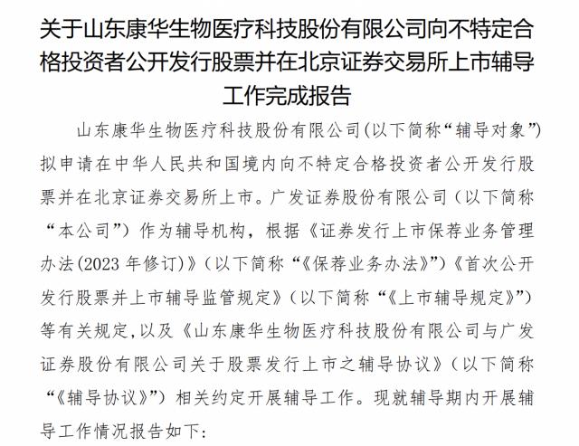 瑞财经 刘治颖 近日,山东康华生物医疗科技有限公司(以下简称康华股权)披露了广发证券作为辅导机构向不特定合格投资者公开发行股票并在北京证券交易所上市辅导的报告。