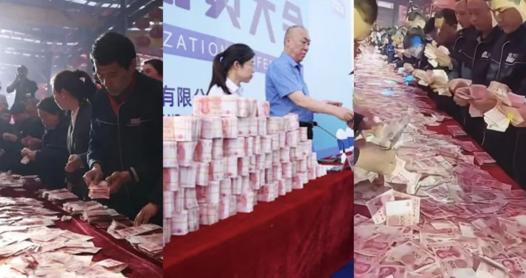 在公司年会上,崔培军将数千万现金铺满了长桌,参加会议的员工可以在有限的时间内随意领取。