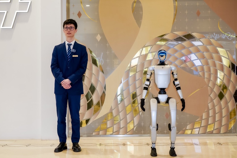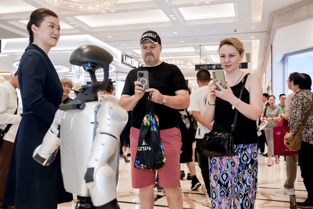 特别值得注意的是,在店庆当天,商场还利用科技赋能,为消费者带来不一样的消费体验。六台宇树机器人与客户服务人员并肩而立,热情地向客户致以诚挚的问候。进入科技体验区,机器人瞬间成为贴心的合作伙伴,精心设置姿势与客户合影,借助机械臂完成精准的倒茶服务,充分展示了科技与服务的深度融合。另外,商场中厅香奈儿 CHANCE 开启香水“原色空间”限时快闪活动,为消费者带来全方位、多层次的感官享受。