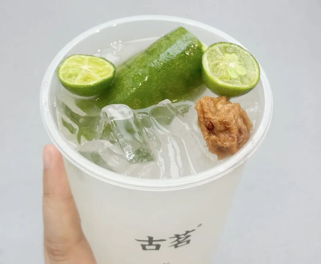 古茶中,梅柠檬汁是在柠檬和小青橙的香味中,增加了几个咸梅元素来丰富口感。酸、甜、微咸在口中爆发,特别生津解渴。