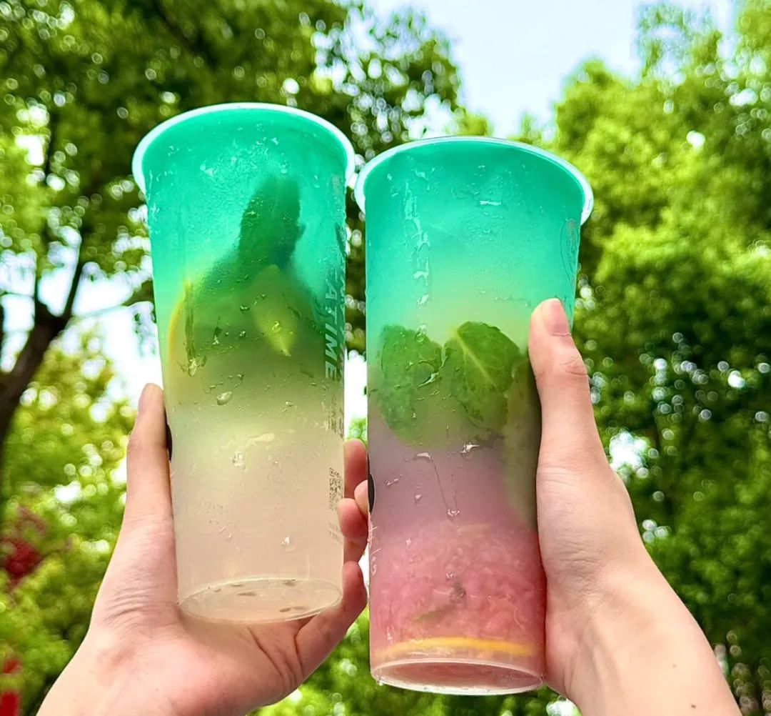 这款产品的价值也是一大亮点。绿色、黄色和白色的渐变颜色非常醒目。加上薄荷叶和冰块的点缀,带来了夏季电影的氛围,吸引了顾客拍照分享,充满了“网感”。