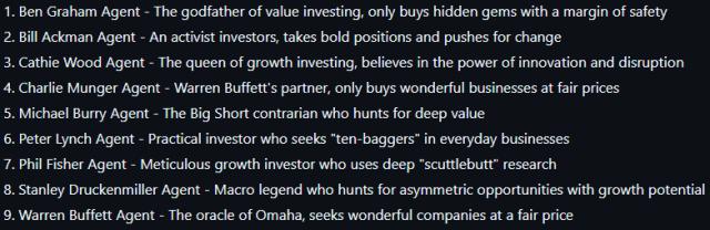 AI Hedge Fund 现在已经提供了 9 一位明星投资者的策略,不仅有大家最熟悉的巴菲特,还有他的老师。 Graham 和 Fisher 都是其中之一。