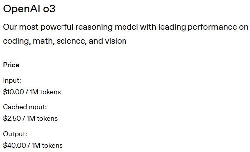 价钱还不低,拿着 OpenAI 的 o3 举例来说,每百万字符输入都要收集 10 刀具,缓存中间结果要求 2.5 刀,导出要 40 刀。