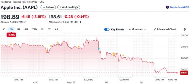 假期五天过去了,你还真别说,四天, 月 30 苹果的最高价格是每股 230 刀,到 5 月 5 号只有 198 刀左右了。