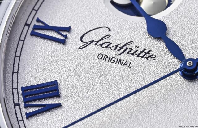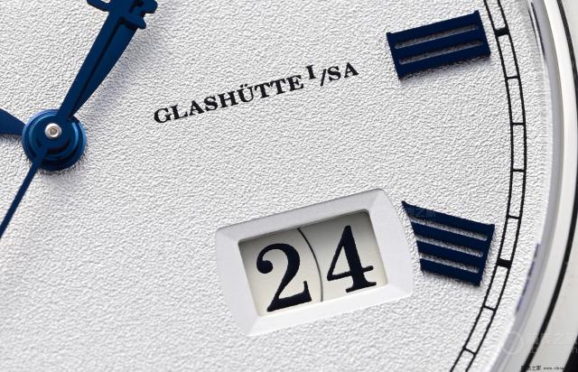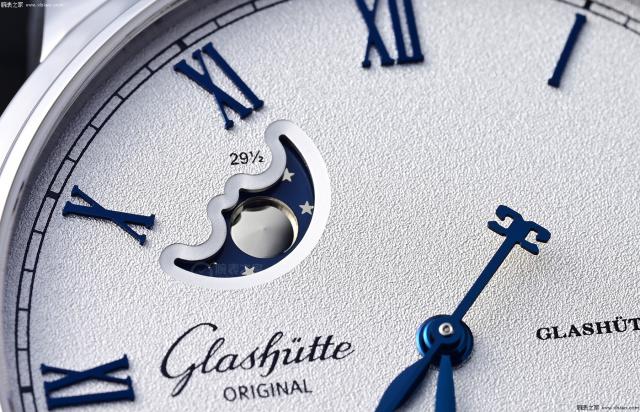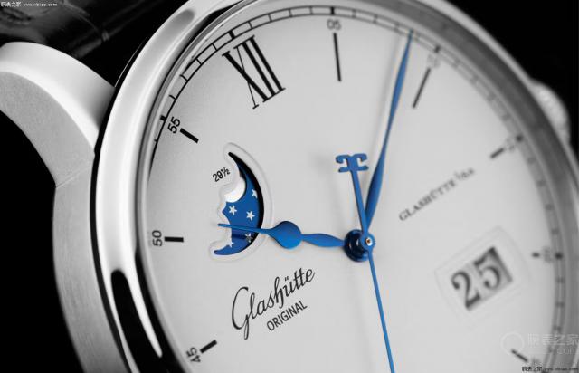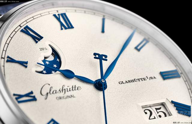 大型日历显示位于 4 点钟位置。从 1997 从2000年开始,大日历就成了格拉苏蒂原创的标志性特征。为达到最舒适的视觉效果,时标还符合功能窗口进行贴合切角设计。10 点和 11 弧形月相盘设置在点区域,两个功能窗口遥相呼应,形成均衡的盘面布局。色彩、纹理和细节的微妙变化,大大增强了表盘的层次感。