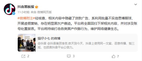 对此,Tiktok黑板报昨晚做出了回应:经核实,贷款广告隐藏在相关内容中,利用批量虚假信息吸引眼球,进行虚假营销,黑灰产品痕迹明显。