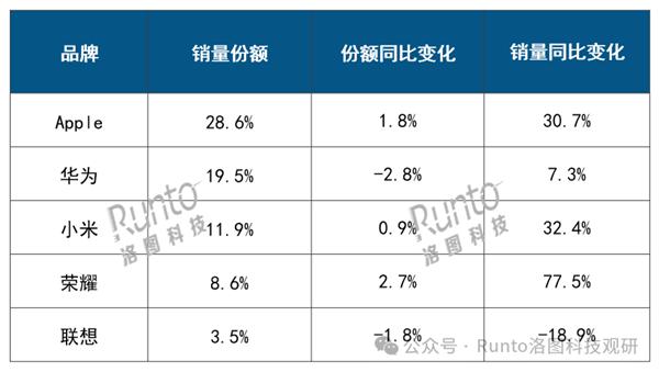 随之而来的是华为 19.5% 线上市场份额排名第二,线上销量同比增长。 7.3%。