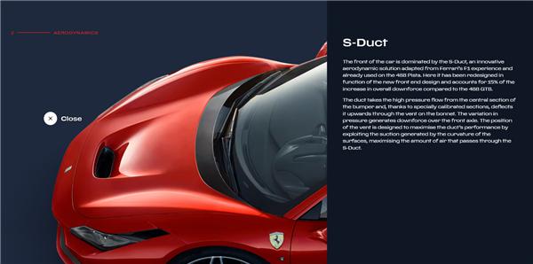 以法拉利 F8 Tributo 举例来说,只有前舱盖处的挖孔。(S-Duct)就能提供比 488 GTB 下降压力增加,增加压力 15%。