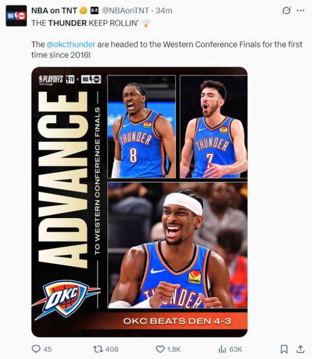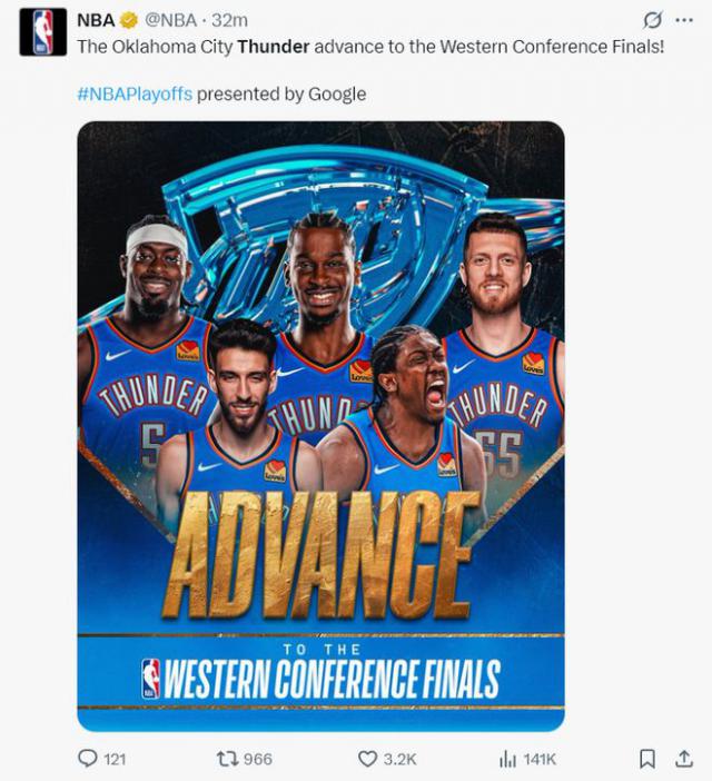随后,许多美国媒体对雷霆进入分区决赛表示祝贺,这是雷霆的历史。 2016 年后第一次进入分区决赛,算上超音速阶段,这支球队的总数也只有 5 第二次进入分区决赛。