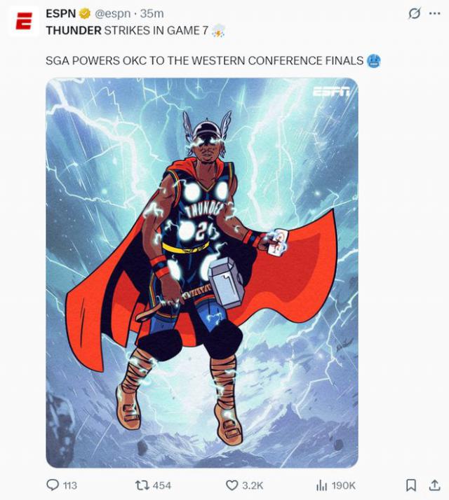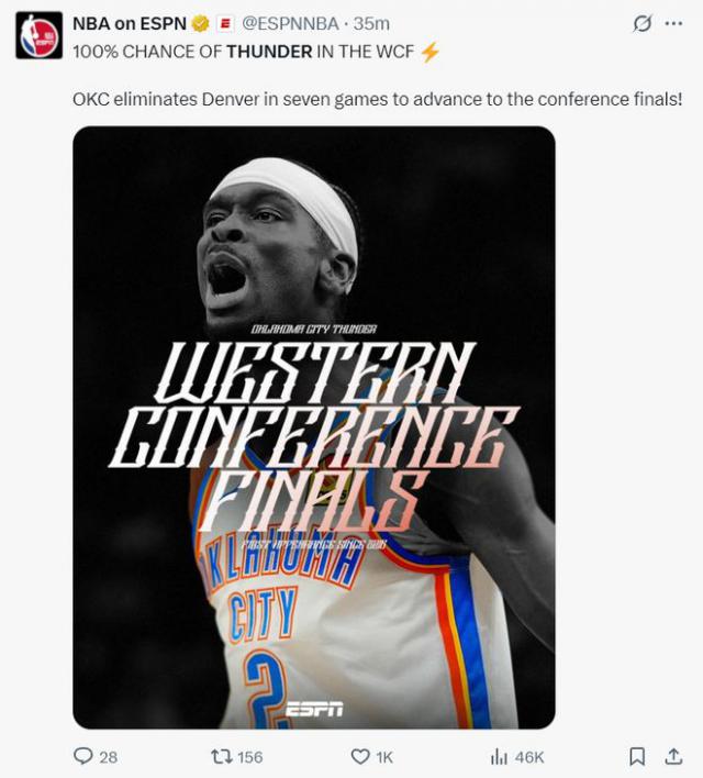 NBA on ESPN 官员写道:在分区决赛中 100% 由于雷电风暴的发生概率, OKC 晋级西决。