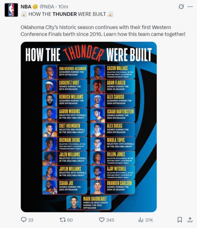 NBA 这位官员正在晒雷霆队 15 3 与主教练戴姆波特一起祝贺他们。 9 年度重返分区决赛。