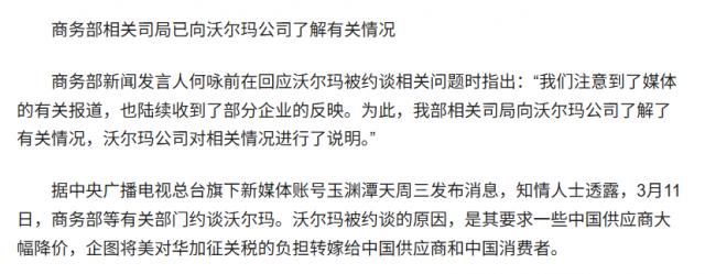 中国商务部于 3 月 11 日本就沃尔玛向中国商家压低价格问题约谈了这个美国非常零售商。在 5 月初,中国商务部宣布考虑与美国谈判后,沃尔玛被曝向江浙等地的中国商户发出增加出货量的请求。那些商家说:“沃尔玛已经告诉我们,我们已经开始增加对美国的出货量,所以我们不需要承担对中国商品征收新关税的额外费用。”。12 在发表联合声明后,中美进一步传出消息称,中国各地的制造商收到了大量的订单,美国供应商出现了报复性的大规模取货。