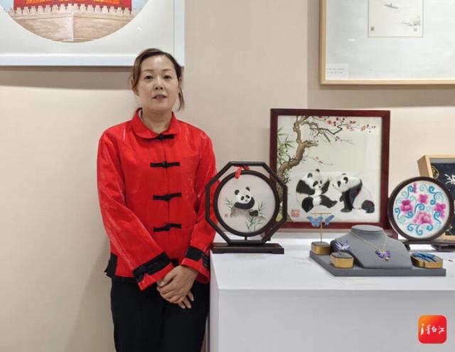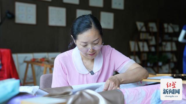 不用说,任晓红的绣功自不必说,一步一步地提升自己,打磨自己,晕针,纱针,点针,覆盖针等技术已经得心应手了。十几年来,任晓红在蜀绣作品中应用了中欧班列、青白江区出土文物、城厢古城等具有地域特色的文化元素,完成了近千件各类作品,多次参加北京故宫“美丽作坊”残疾女性文化创意展、法国巴黎中国残疾女性文化创意展等国家文化创意产品展。“就在昨天,我们绣坊 23 一件作品还在北京故宫展出,我特意参加了开幕式才回来。"任晓红口中的故宫展正是 2025 四川残疾人文创造成果展由四川省残疾人联合会、四川省文化旅游厅、成都市残疾人联合会共同筹备。《千里江山图》系列文化创意绣品,来自十二针绣坊,成为现场焦点。