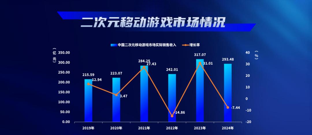 根据《2024年中国游戏产业报告》,今年我国二次元移动游戏市场实际销售收入为293.48亿元,同比下降7.44%,声量不如游戏(398.36亿元),仅强于首页游戏和单机游戏。
