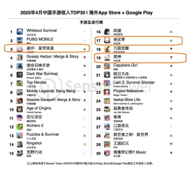 Sensor 根据Tower的数据,虽然米哈游在2025年4月仍然排在收益榜第四位,但是整体收益比上个月增长了51%。