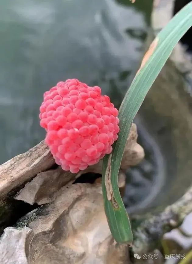 在巡逻河道时,上海金山水泾镇水库村的村民志愿者们也发现,河岸上出现了大量的粉红色福寿螺卵块。