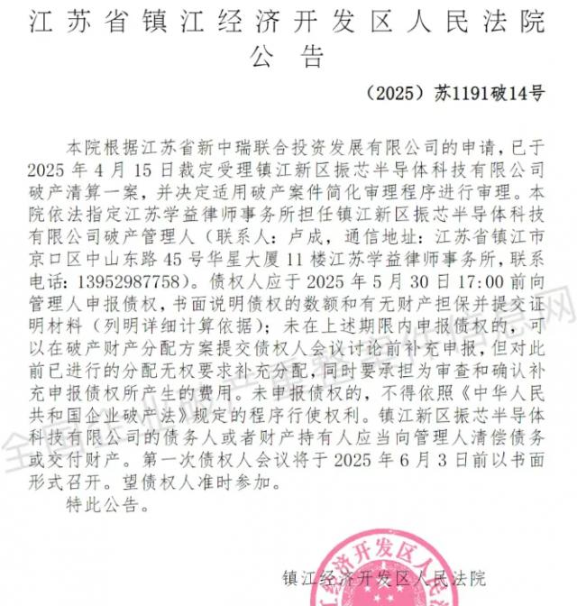 电子发烧友网综合报道。 近日,江苏省镇江经济开发区人民法院宣布,镇江新区振芯半导体科技有限公司破产清算案正式受理。