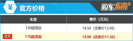 我们特别推荐全系列车型的参考价格。 19.98 万元的 170 超混版。相比售价低 1.4 万元的 130 超混版,推荐车型在主要版本中。 / 在被动安全配置方面完成了全新的升级,安全驾驶更加安全。与此同时,它配备了更大容量的动力电池,CLTC 纯电续航里程较长,进一步扩大了纯电出行半径。另外,在舒适、方便、娱乐功能等方面,该车型也具有明显的优势,整体用车体验有了明显的提升。