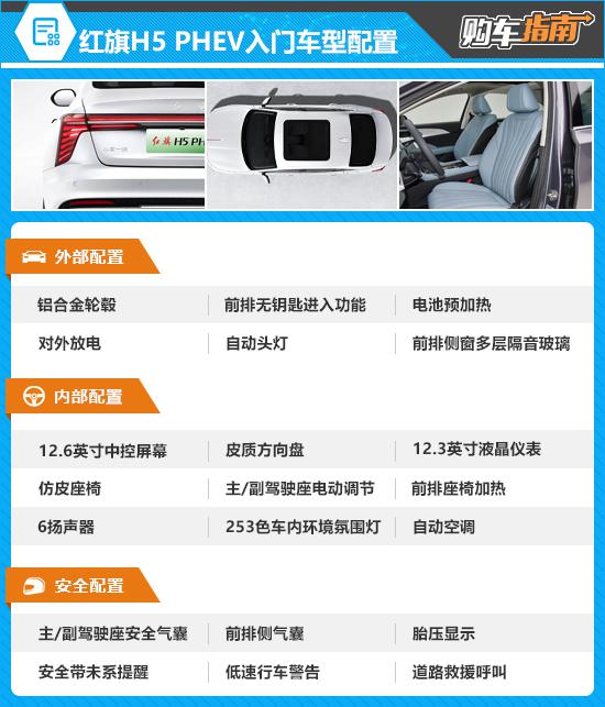 2025 款红旗 H5 PHEV 入门级车型的价格是 18.58 万元,具体来说,配备丰富,提供前排无勺进入功能、对外放电、自动大灯、皮革方向盘、前排座椅加热、自动空调、胎压显示、低速行车警告、道路救援呼叫等配置。考虑到日常生活中的汽车,已经能够满足基本的代步需求。但是,鉴于高配车型对车辆体验的提升更加明显,价格差异也不大,所以不推荐入门级车型。