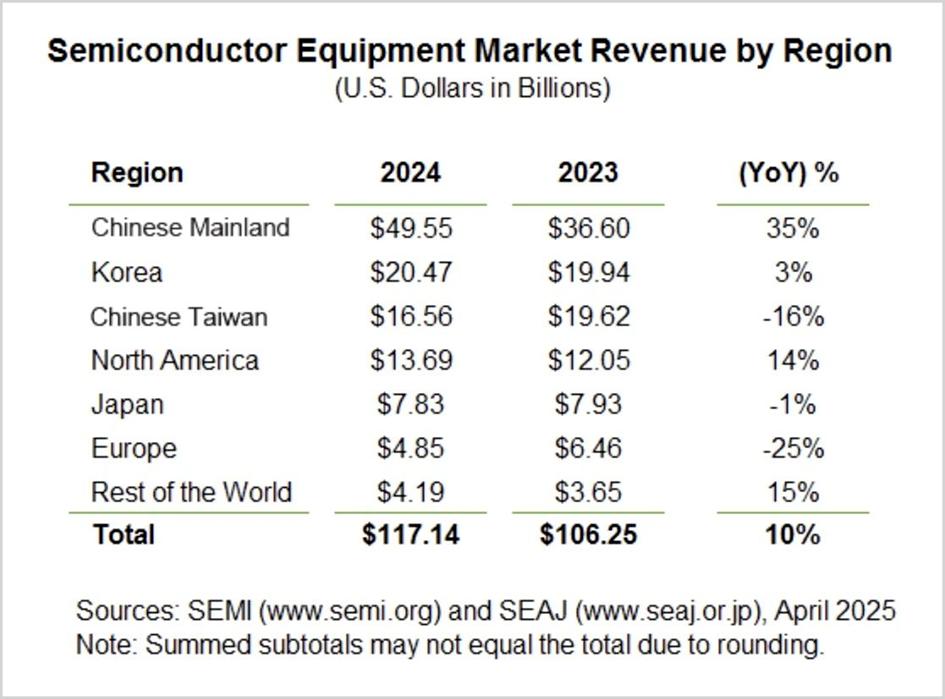 根据最新的世界排名,目前全球前五大半导体设备制造商分别是应用材料,ASML、东京电子,LamResearch和科磊(KLA),全球半导体设备Top10里只有北方华创这个中国制造商。但是,SEMI数据显示,2024年全球半导体设备市场规模达到1170亿美元,同比增长10%,其中中国大陆设备支出达到495亿美元,同比增长35%,占全球市场的42.3%。