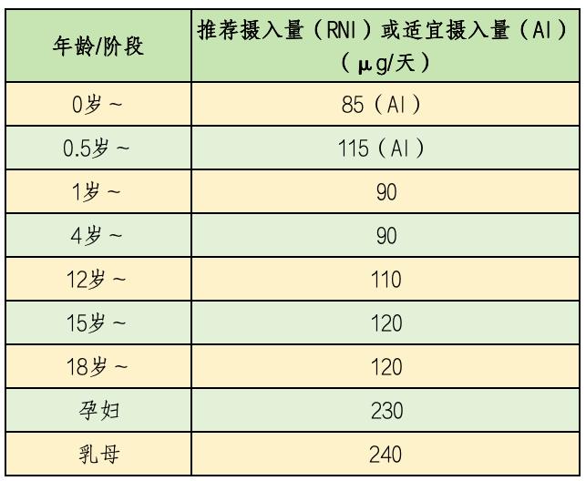 建议在不同年龄/阶段摄入碘。(RNI)或者适量摄入(AI)