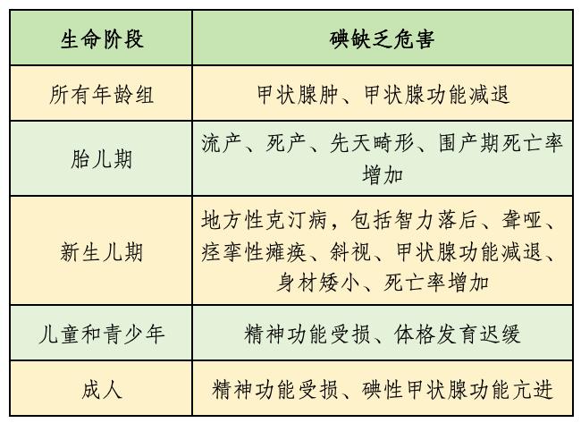 甲状腺素在人体中起着极其重要的作用。它参与了身体的新陈代谢,大多数器官的正常运转离不开它的存在。碘是甲状腺素产生的必要原料之一。碘缺乏会在不同的生活阶段带来一定程度的危害。
