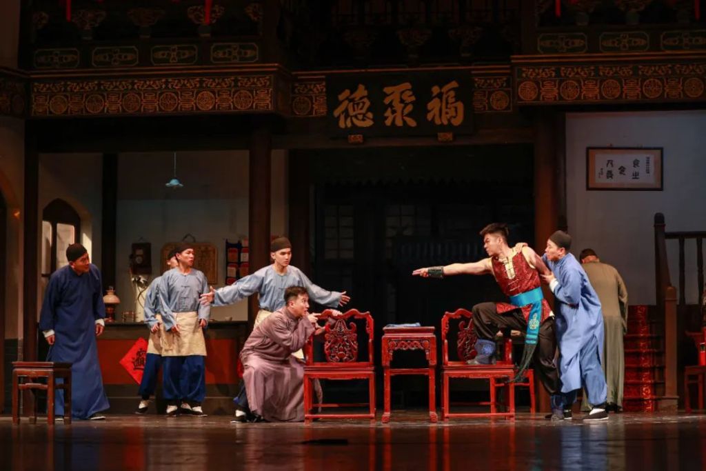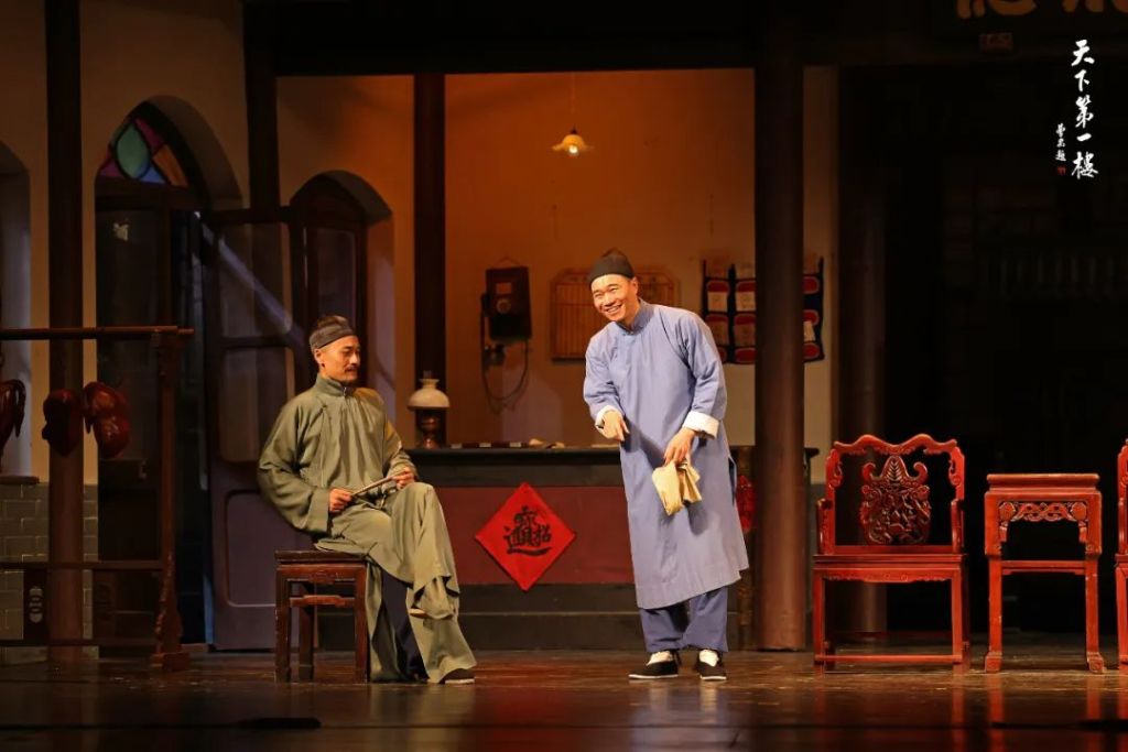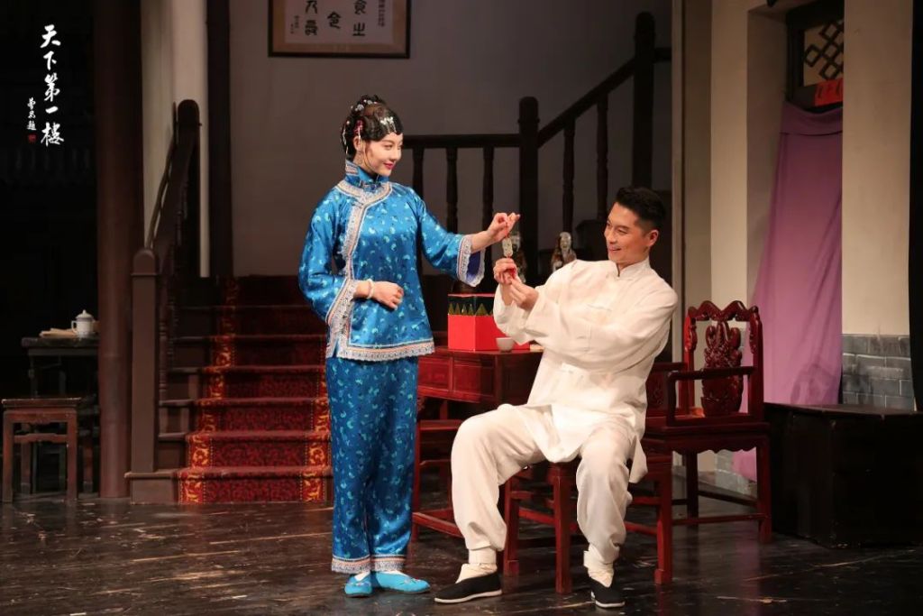 这一轮表演剧照 杨明鑫(中)饰演修鼎新 "好的危楼,谁是主人,谁是客人;只有三栋老房子,时须皓月时须风。"一对对联道尽人情冷暖。 (剧照拍摄 李春光)