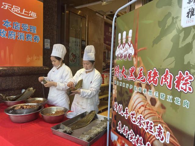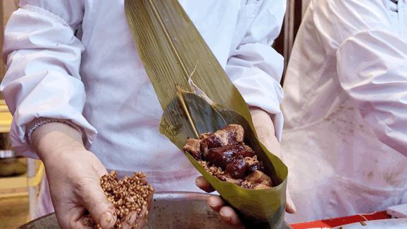 在南京东路 719 号新雅粤饭店门口,粽娘正精心包着特大的黑毛猪肉粽。